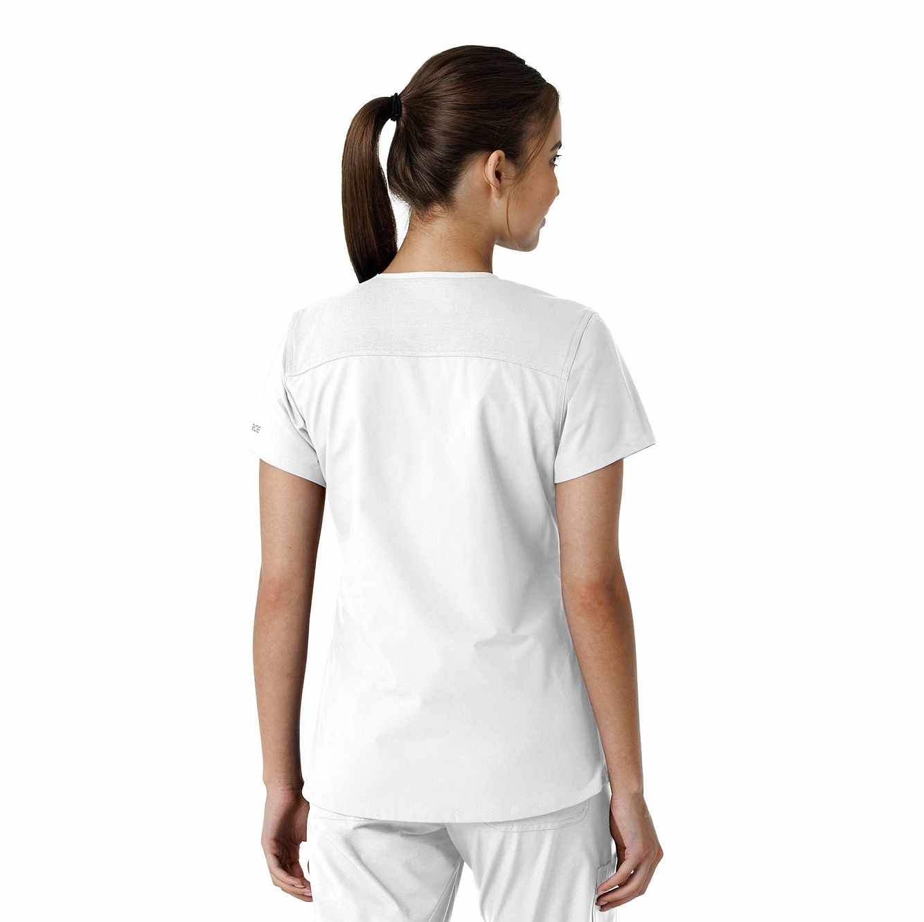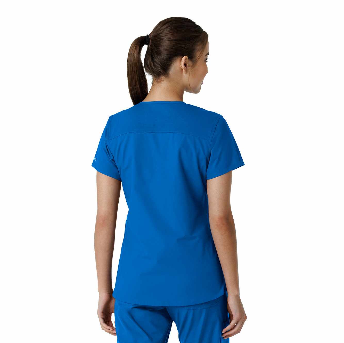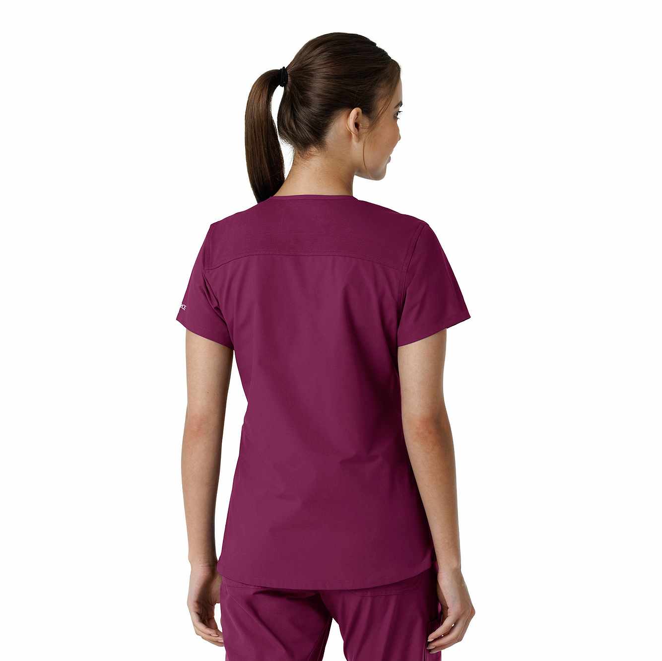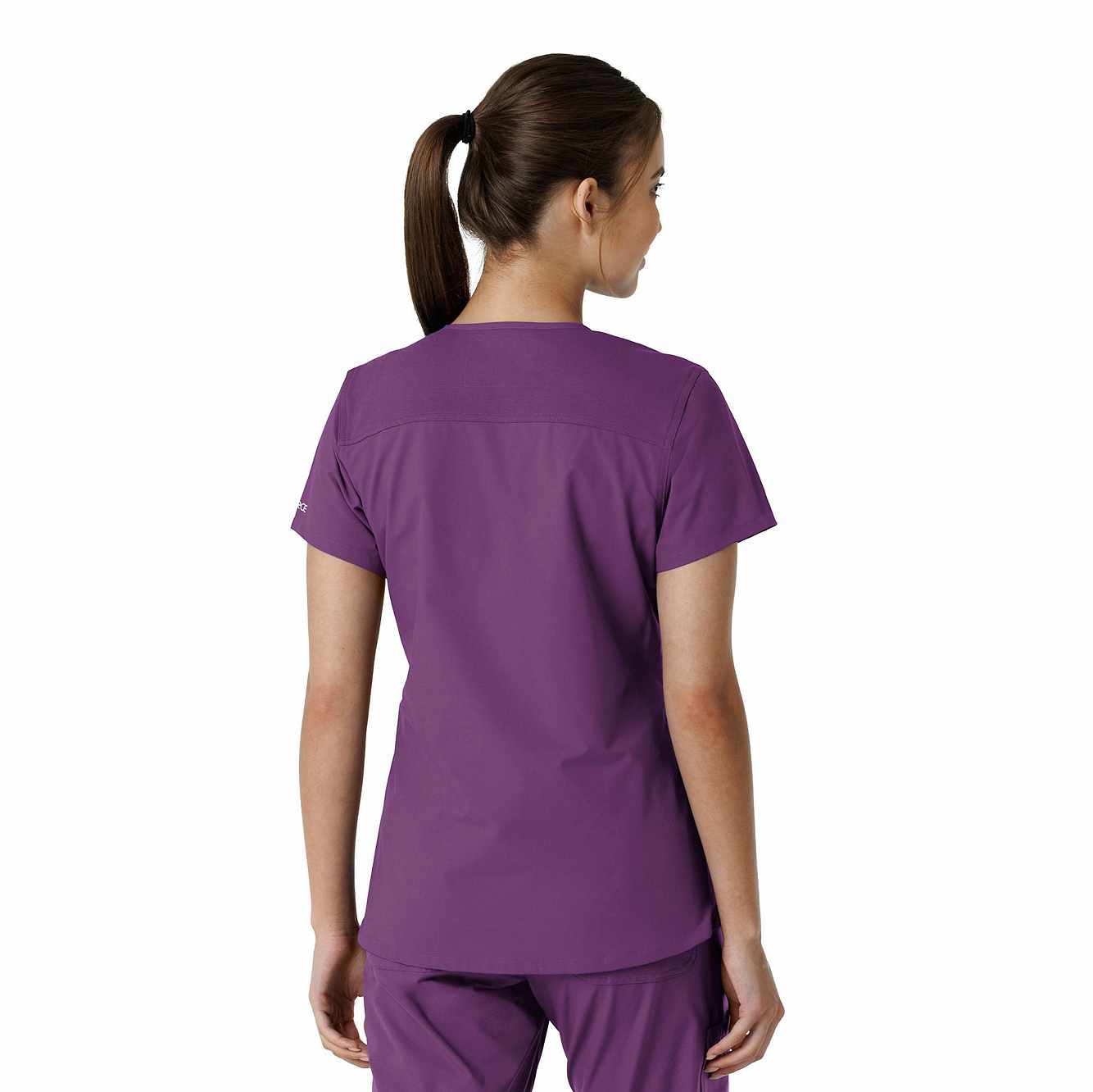 Stay comfortable and move freely with the Carhartt Force Essentials Women's V-neck Scrub Top. Featuring a back yoke knit panel, this top offers flexibility and a tailored fit with a 3/4" V-neckline and curved hem. FastDry® tech wicks away sweat, and Stain Breaker® makes stain removal easy. With two roomy front pockets, an ID badge loop, and dedicated cell phone and scissor pockets, it's built for utility and comfort.