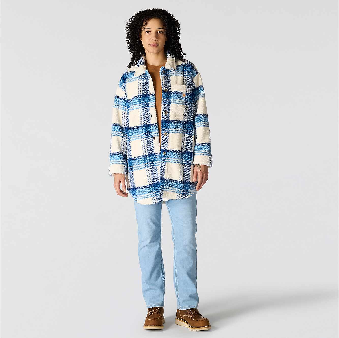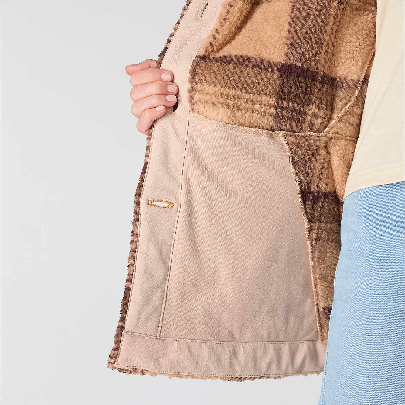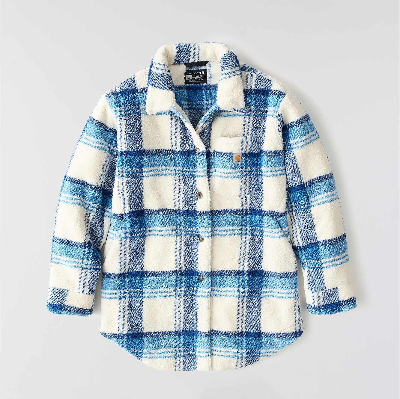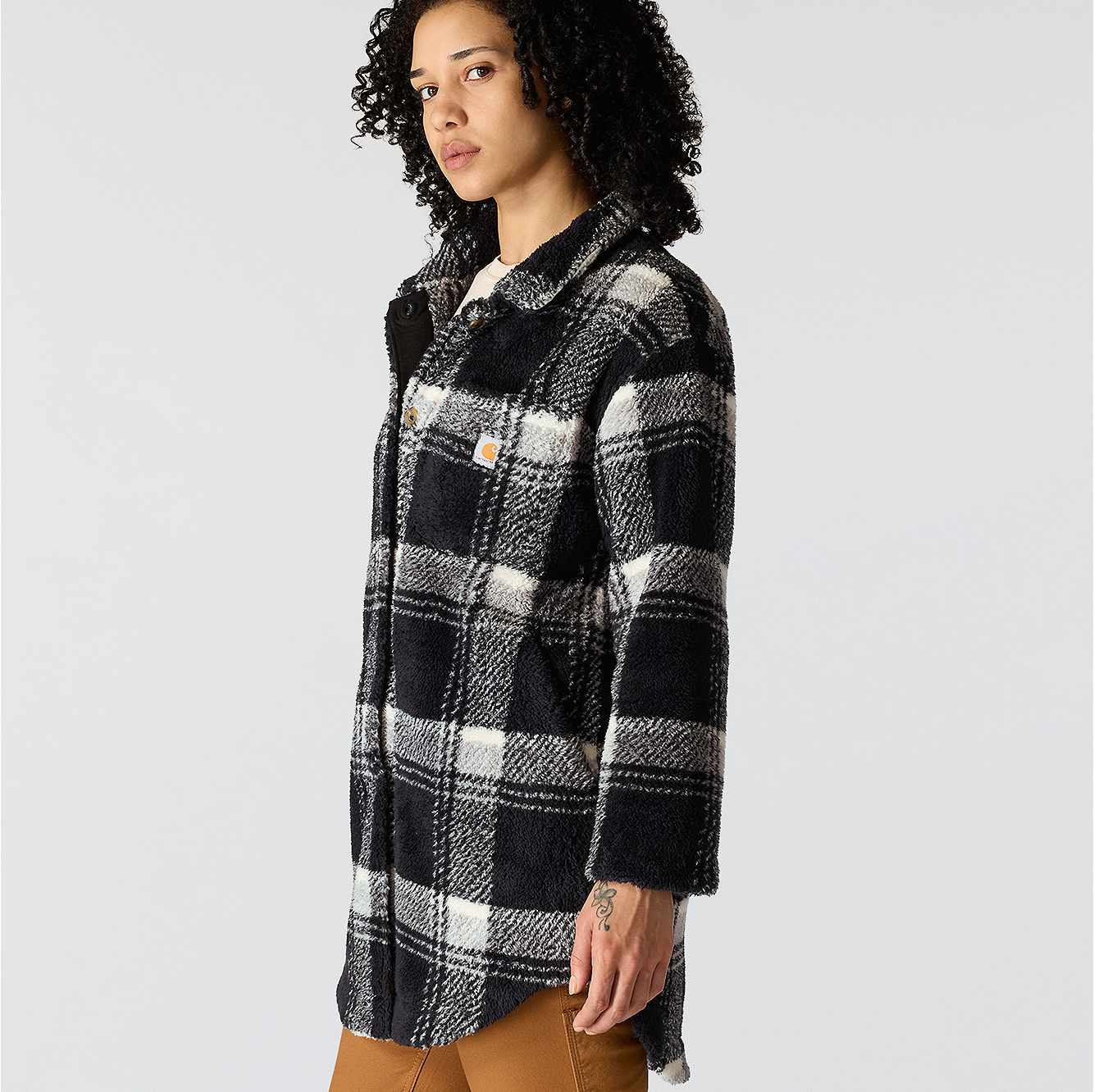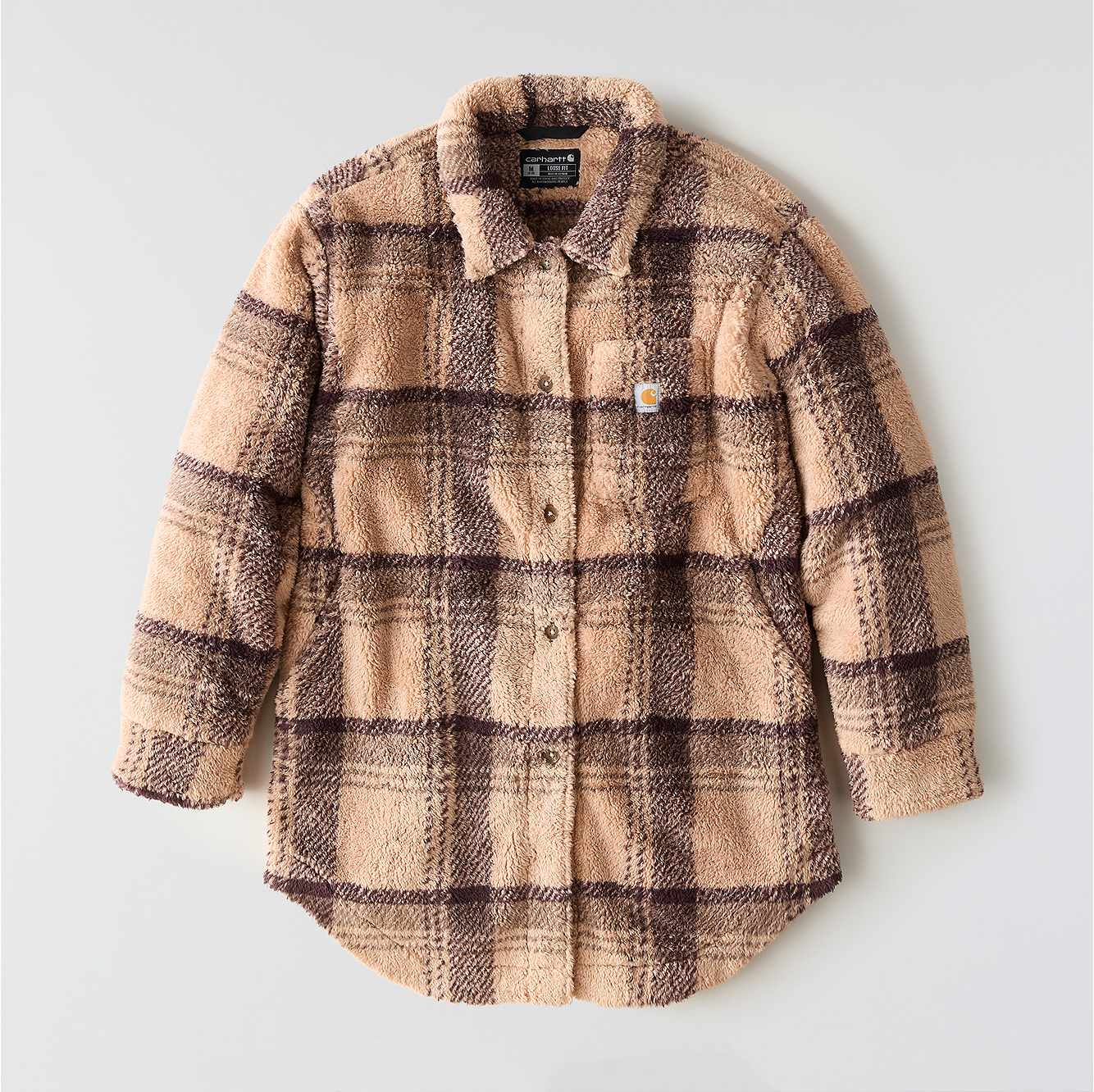Easy-moving and versatile for warm or cool days, this women's button down fleece jacket feels as comfy as it looks. Made of plush fleece with a long cut, two side pockets, and a chest pocket with a Carhartt patch. A loose fit offers plenty of room to layer and move.