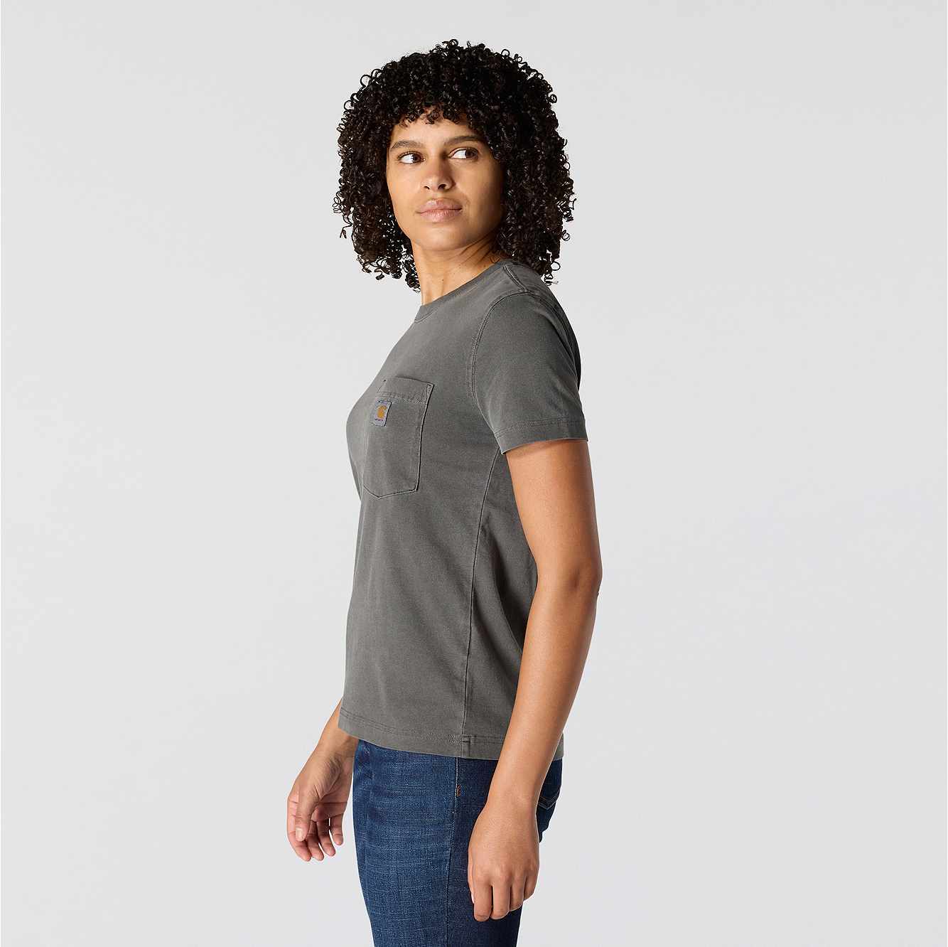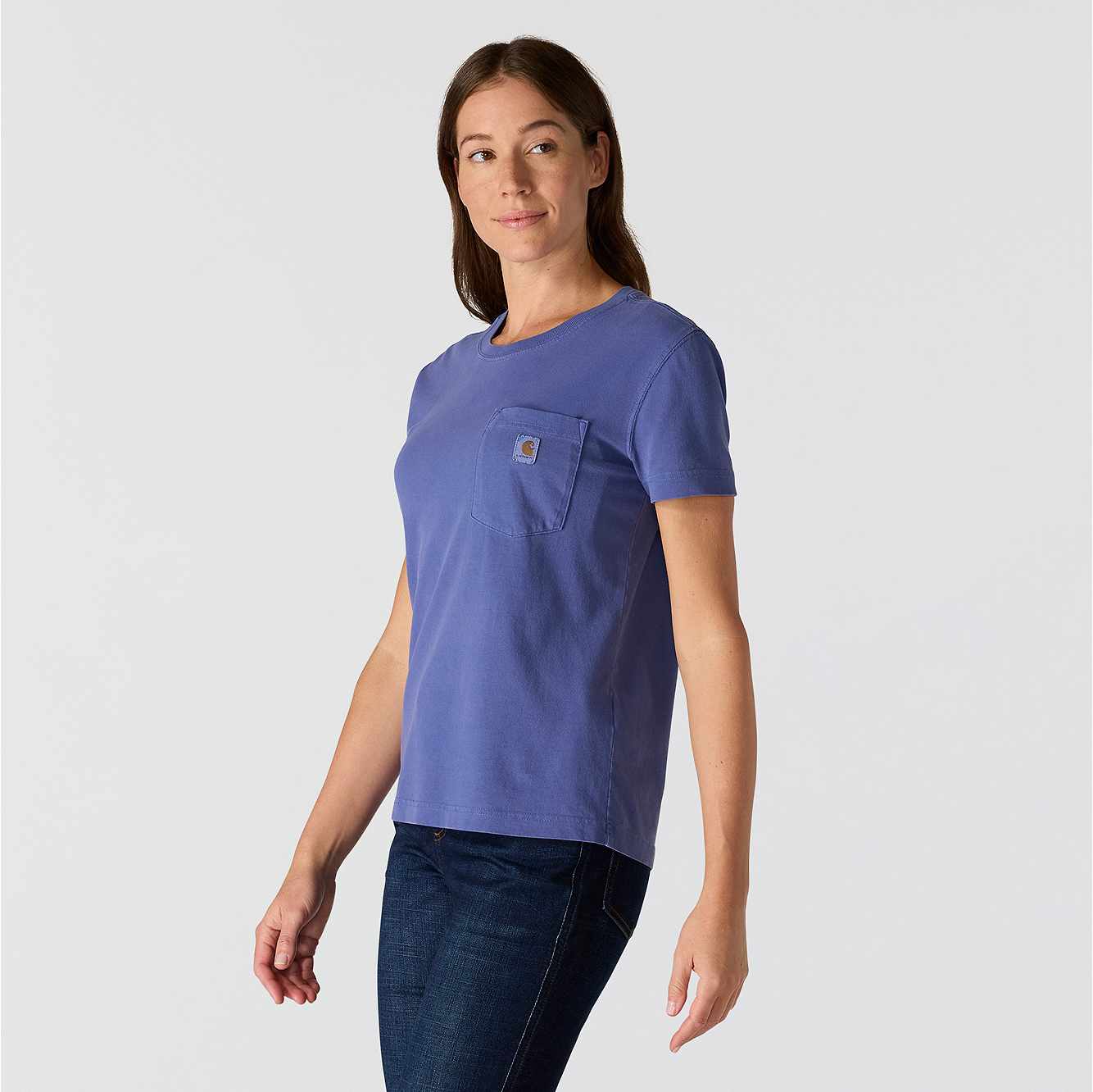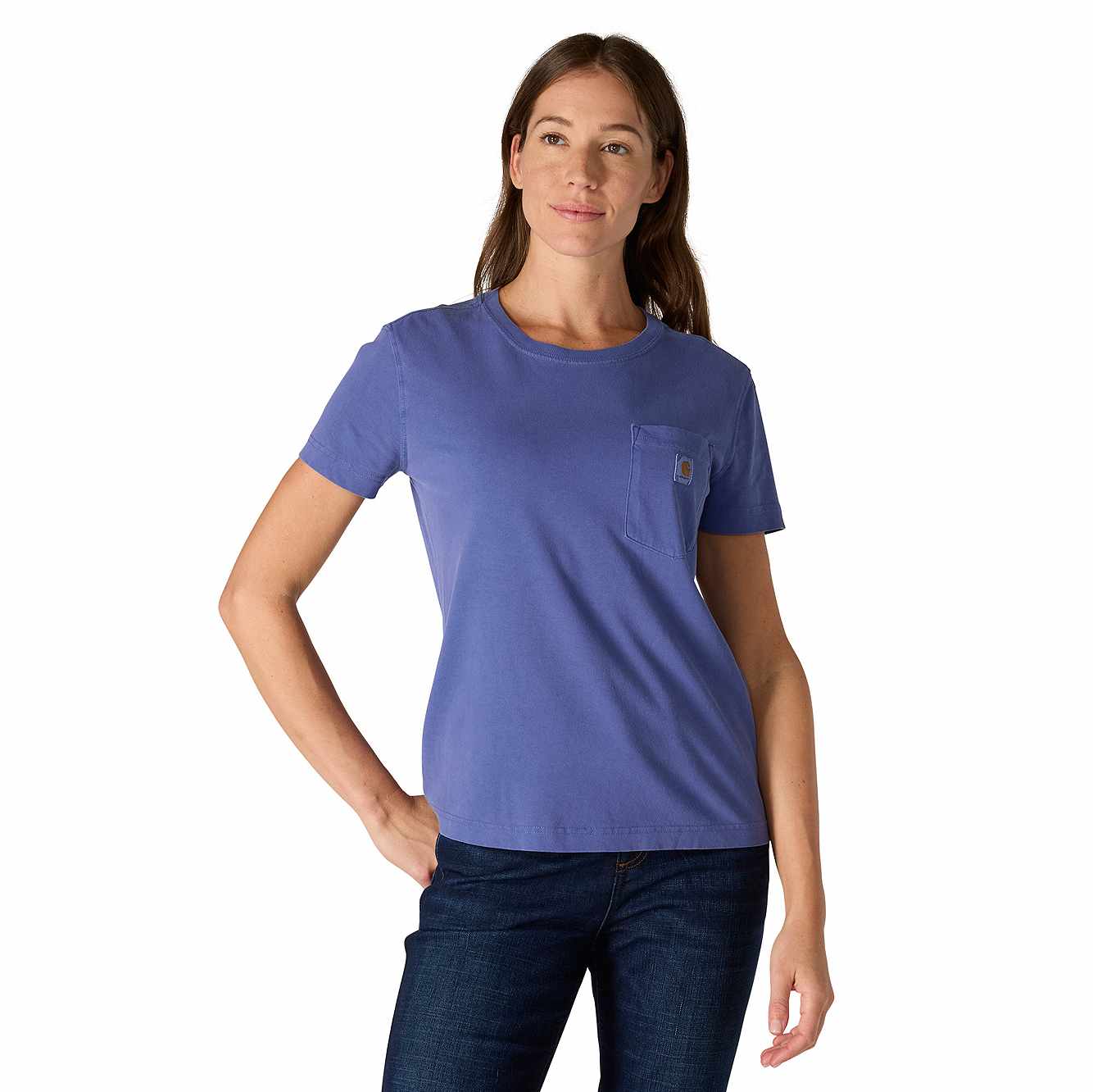 A century of tough jobs and even tougher folks have built the Carhartt name. This women's pocket t-shirt honors that legacy with a chest pocket and a worn-in, garment-dyed look. Cotton feels lightweight and soft from first wear.