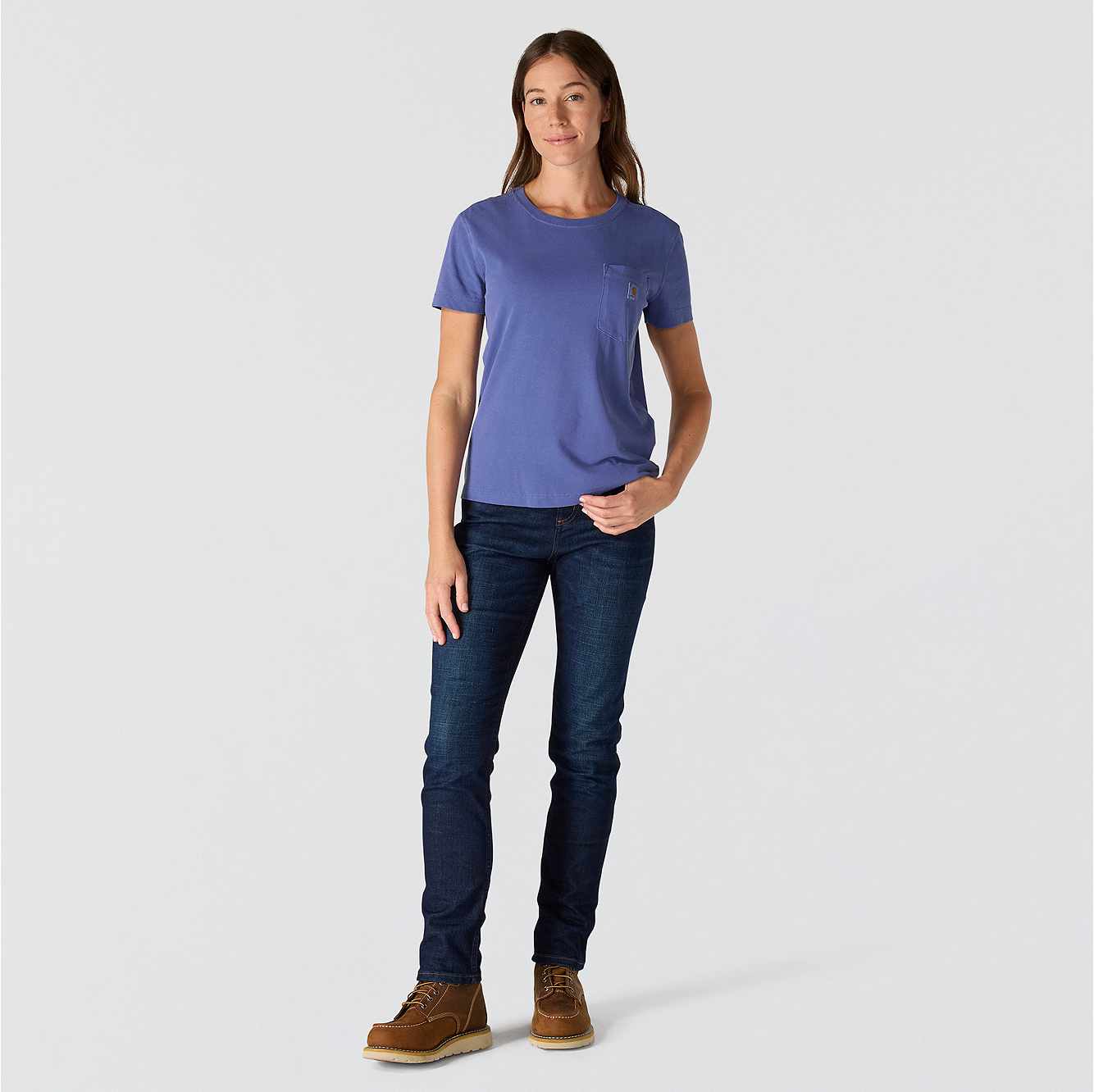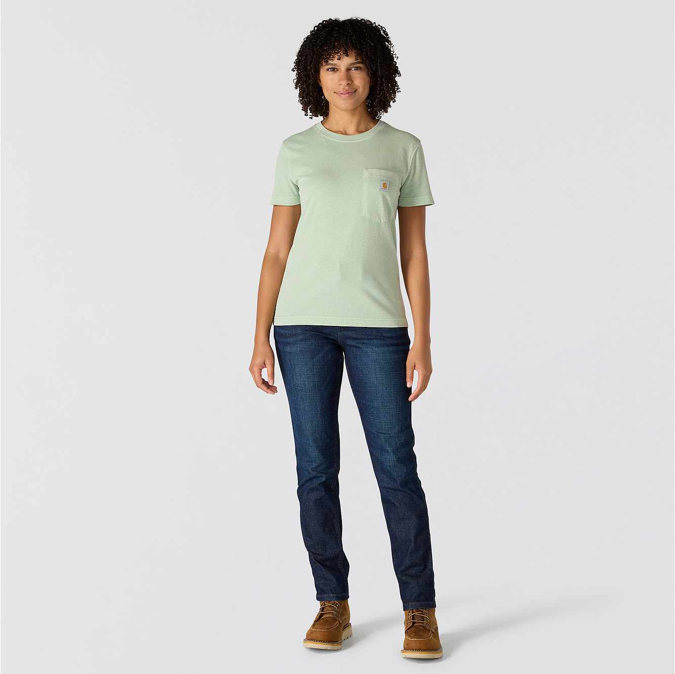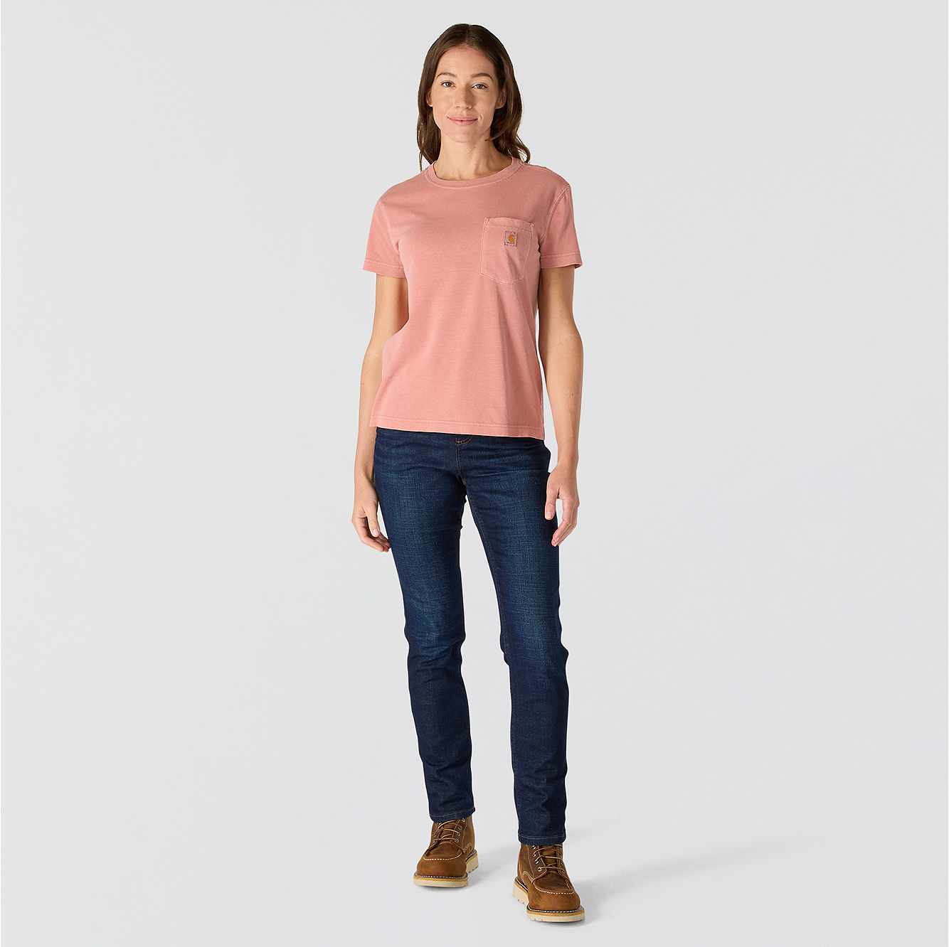 A century of tough jobs and even tougher folks have built the Carhartt name. This women's pocket t-shirt honors that legacy with a chest pocket and a worn-in, garment-dyed look. Cotton feels lightweight and soft from first wear.