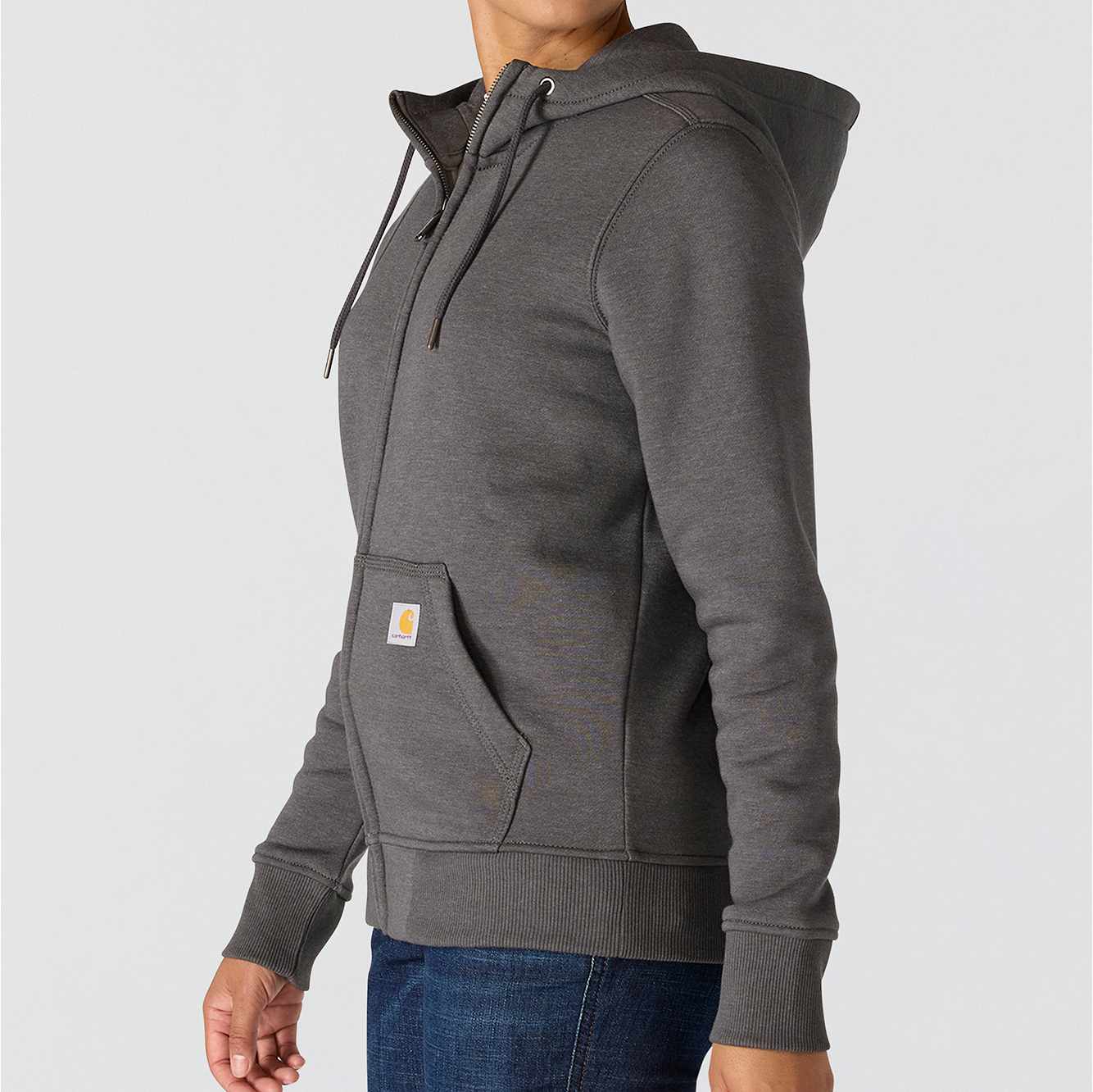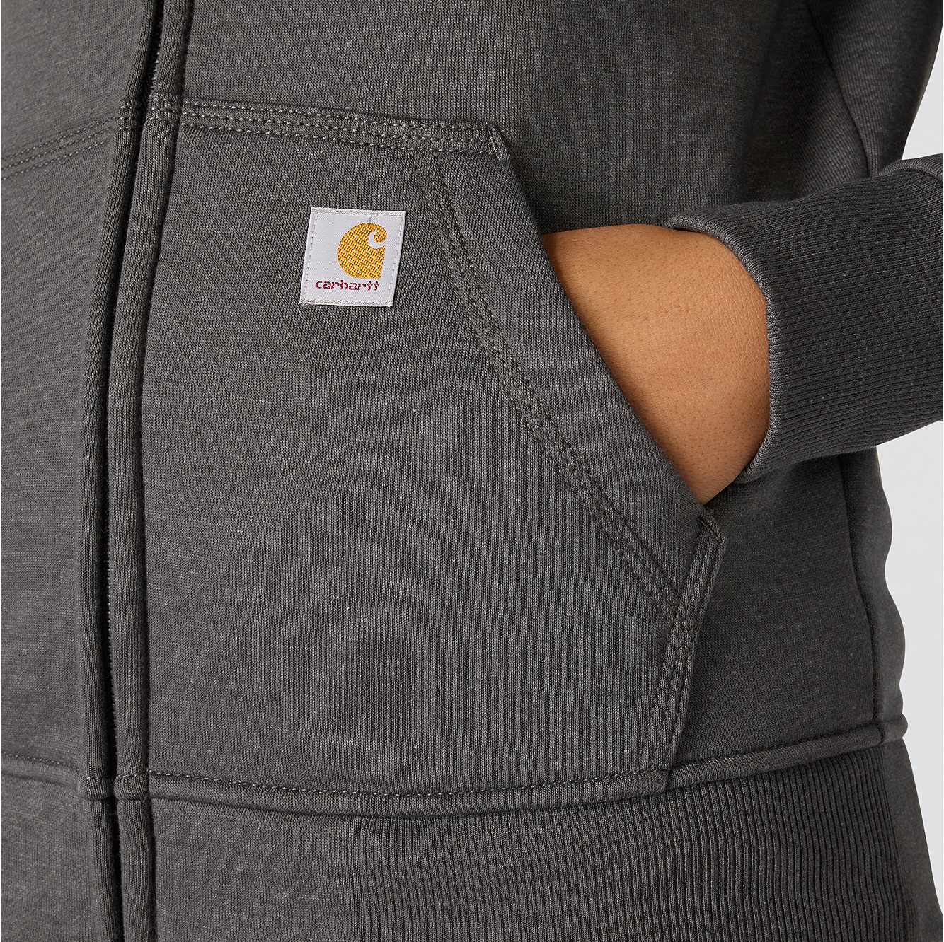 This women's hoodie has the soft feel of a favorite sweatshirt with warmth and durability that you would expect with a Carhartt garment. It's made of heavyweight fleece, with a relaxed fit that allows for easy layering. A kangaroo pocket in the front gives you a place to warm your hands.