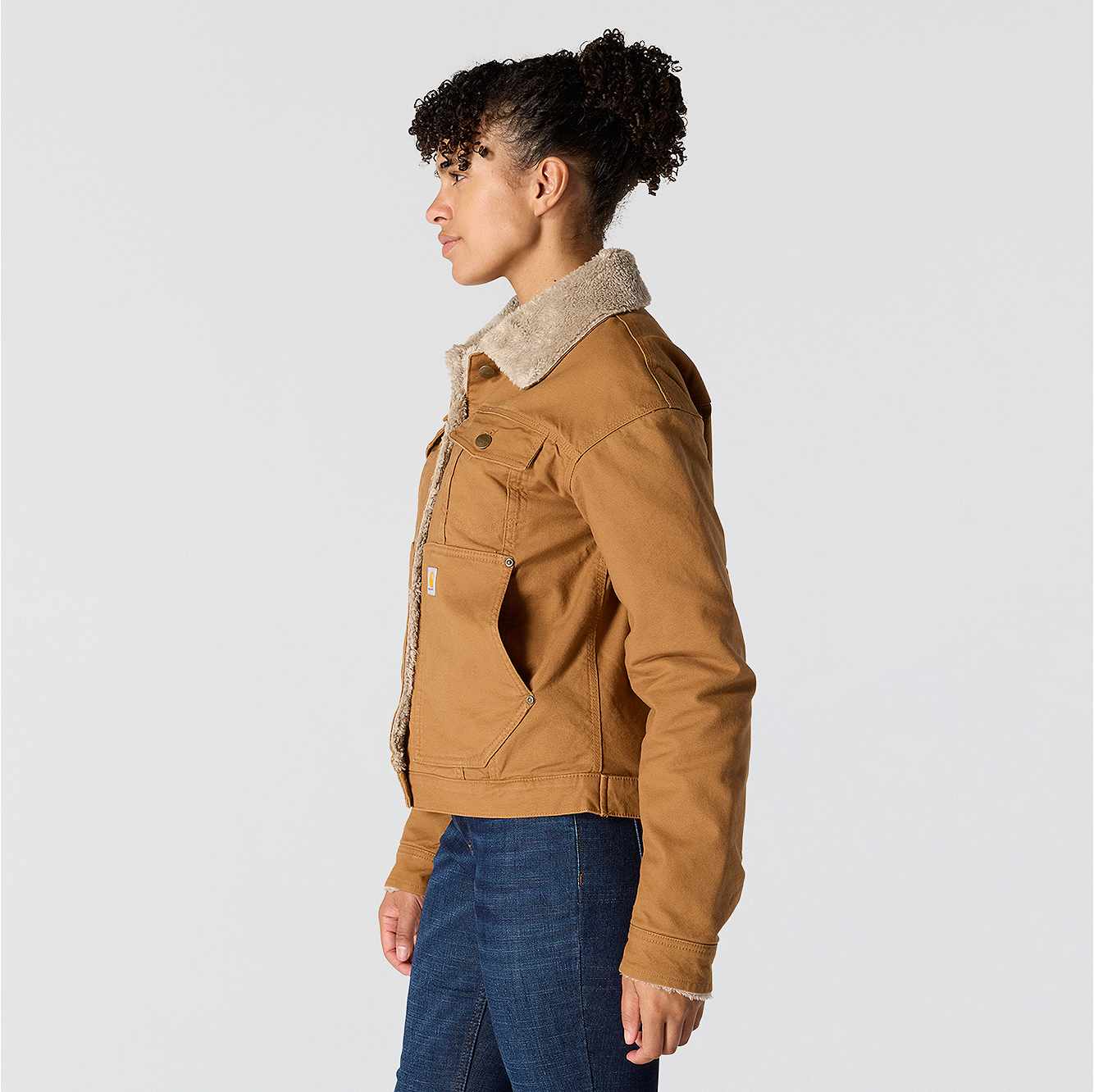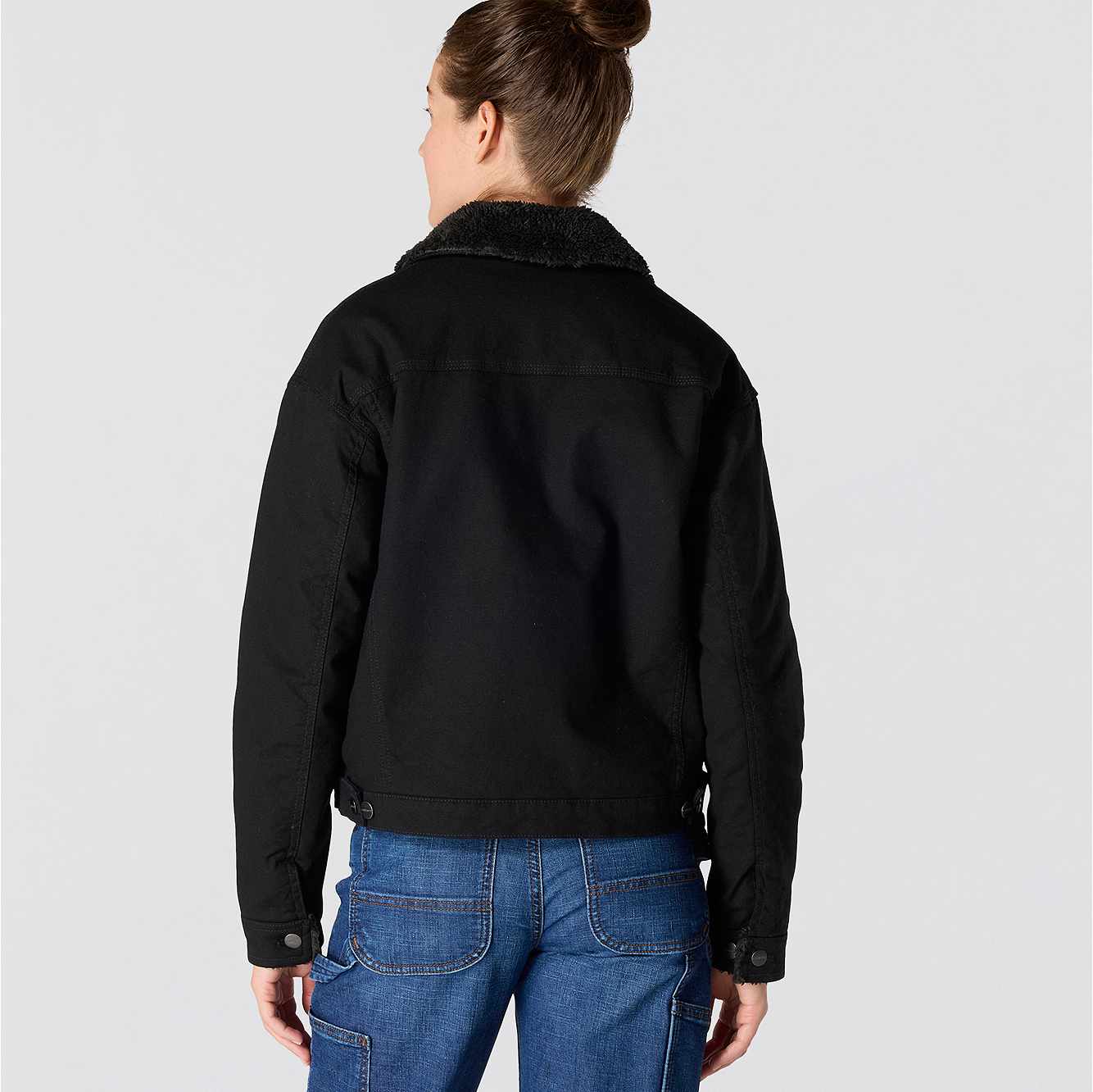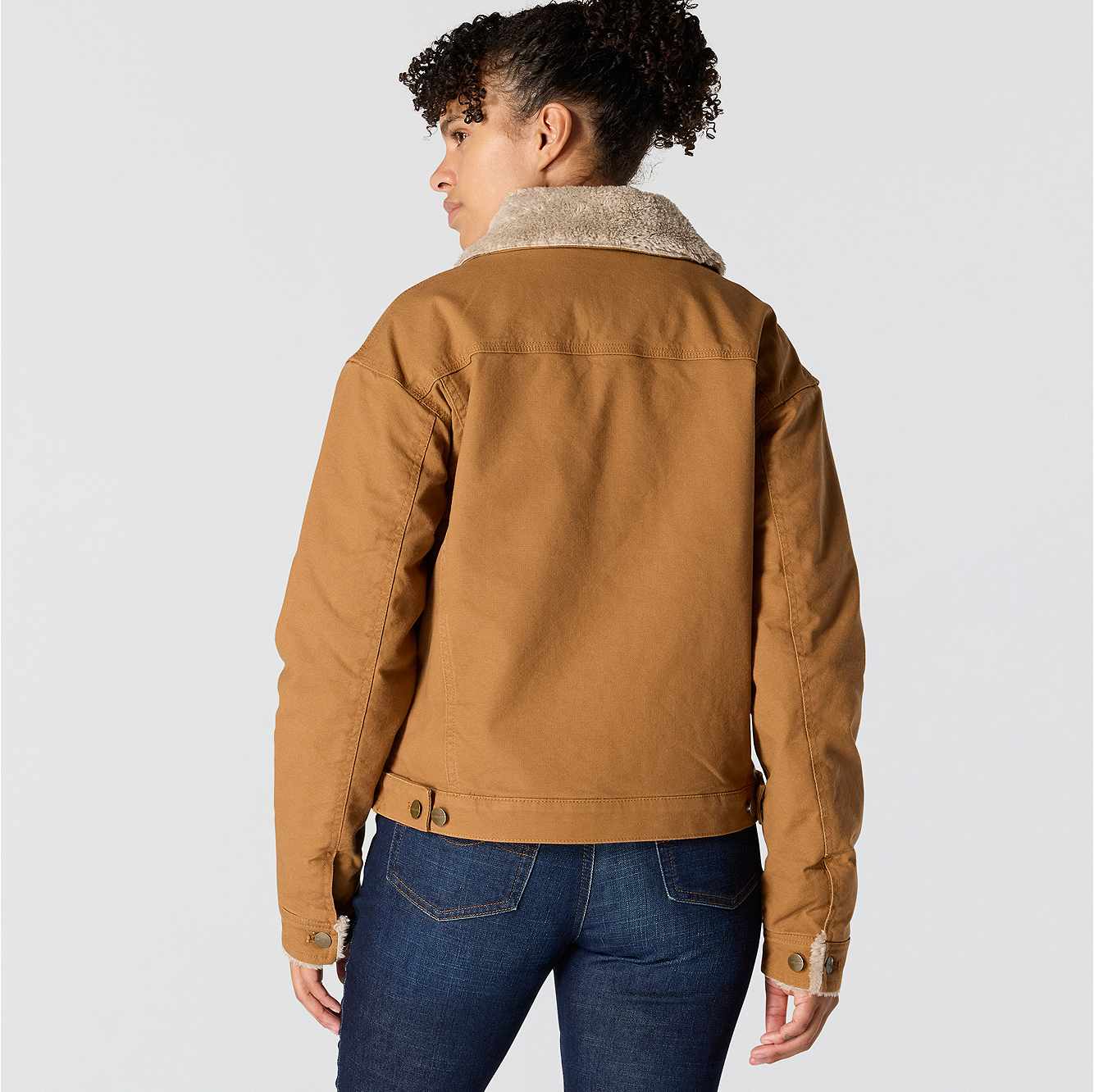 Withstand cold weather in this women's canvas sherpa lined jacket. It's lined with soft sherpa fleece for a warm and comfortable feel. Rugged canvas duck has built-in flex so you can lift and stretch without restriction. A loose fit gives you plenty of room to move.