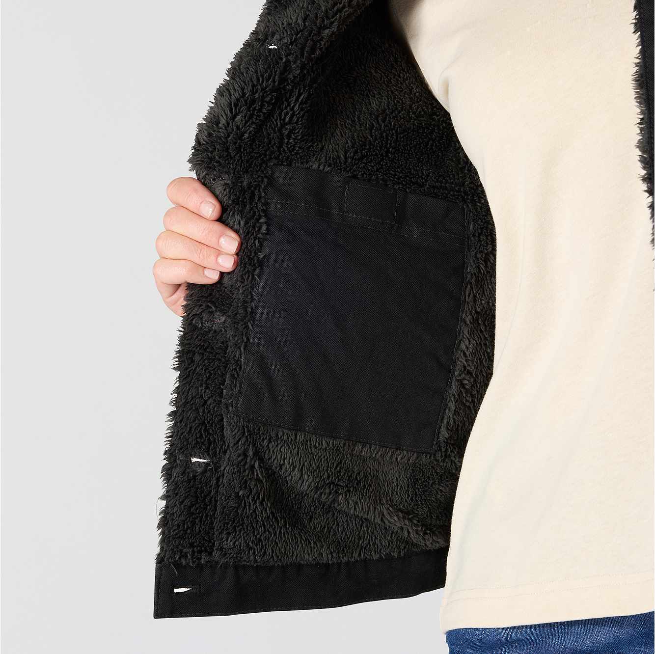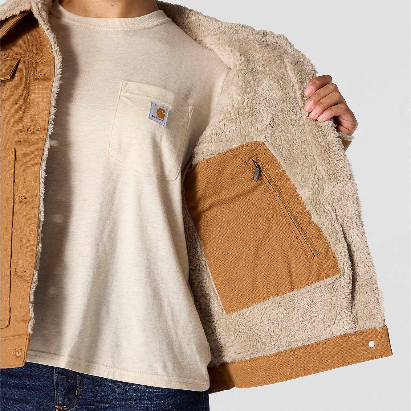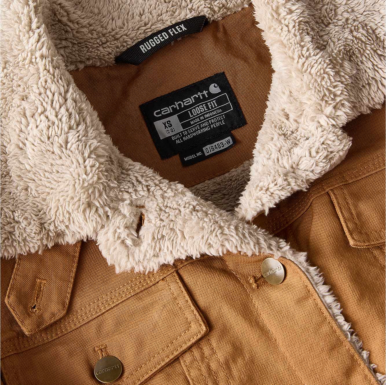 Withstand cold weather in this women's canvas sherpa lined jacket. It's lined with soft sherpa fleece for a warm and comfortable feel. Rugged canvas duck has built-in flex so you can lift and stretch without restriction. A loose fit gives you plenty of room to move.