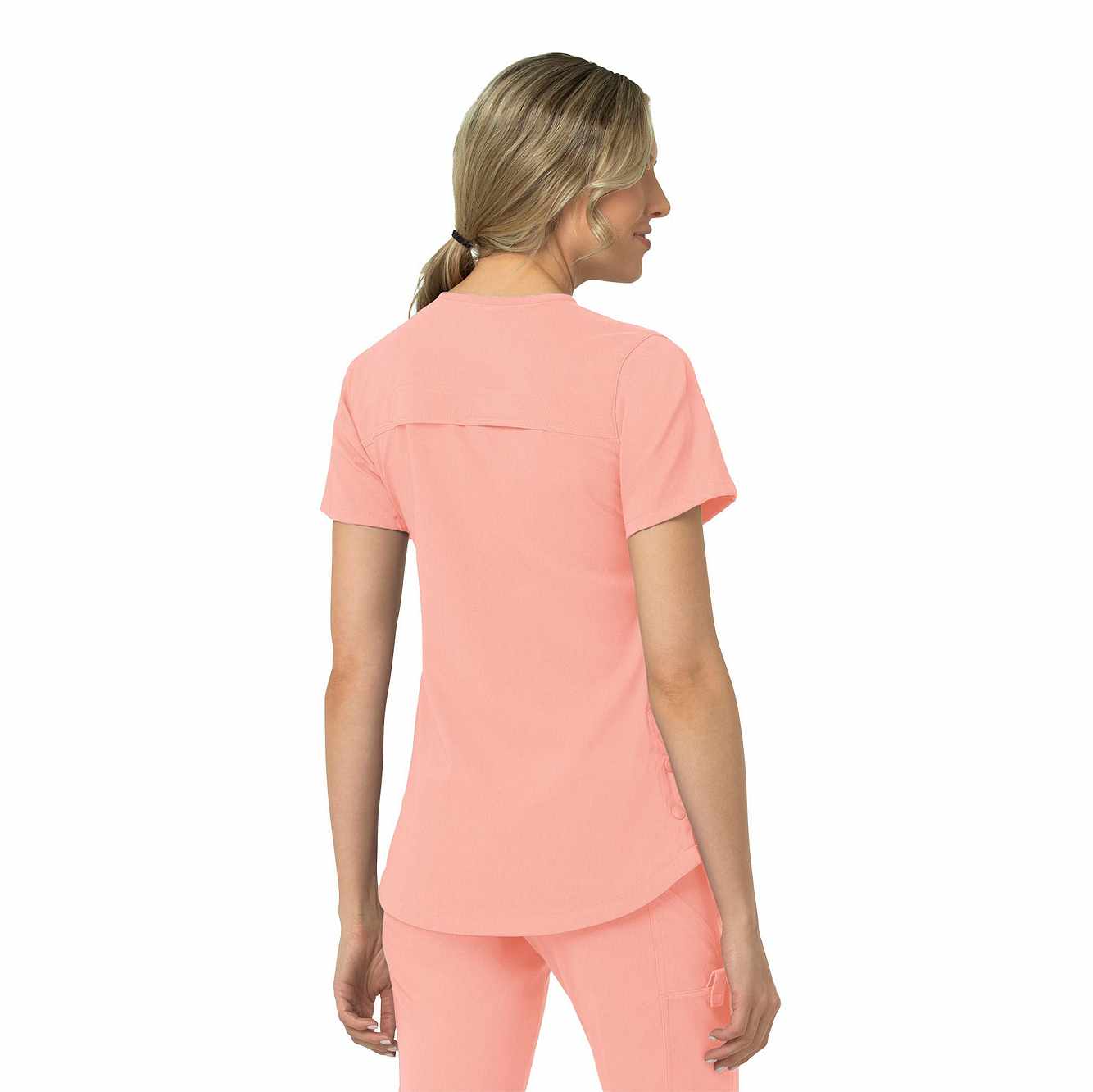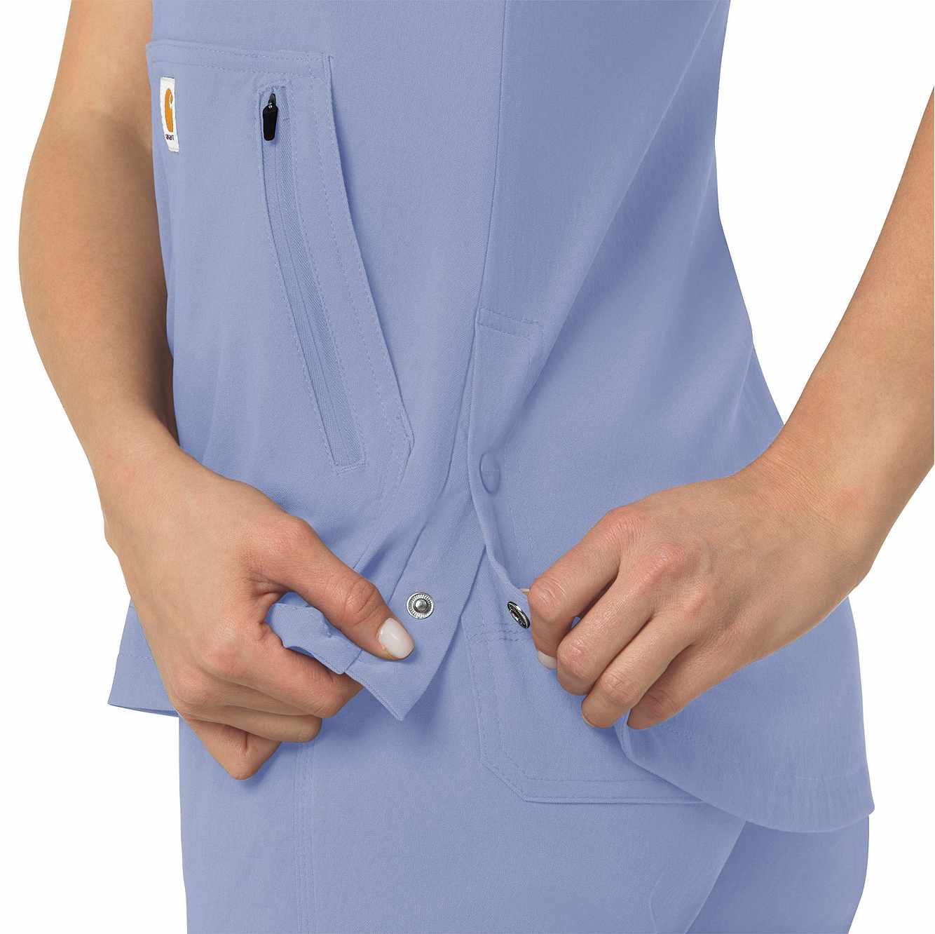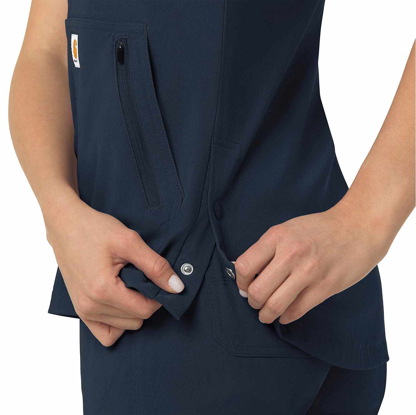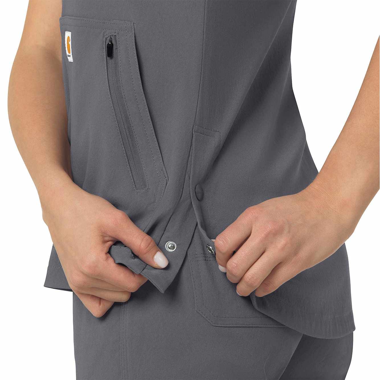 When your workday is non-stop, this women's scrub top keeps you cool and comfortable. Polyester fabric with built-in flex repels water and water-based stains. A mesh-lined back panel allows the air to flow as you move through busy shifts. Multiple pockets, including two angled zip pockets, keep supplies within easy reach.