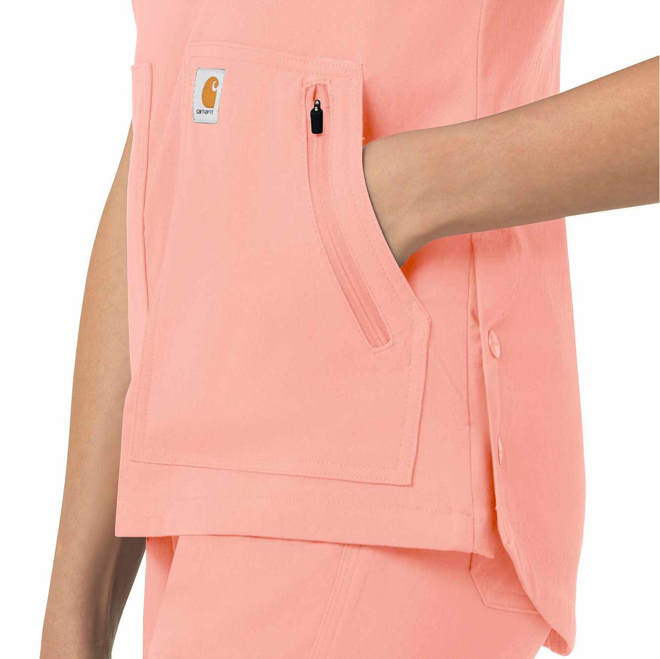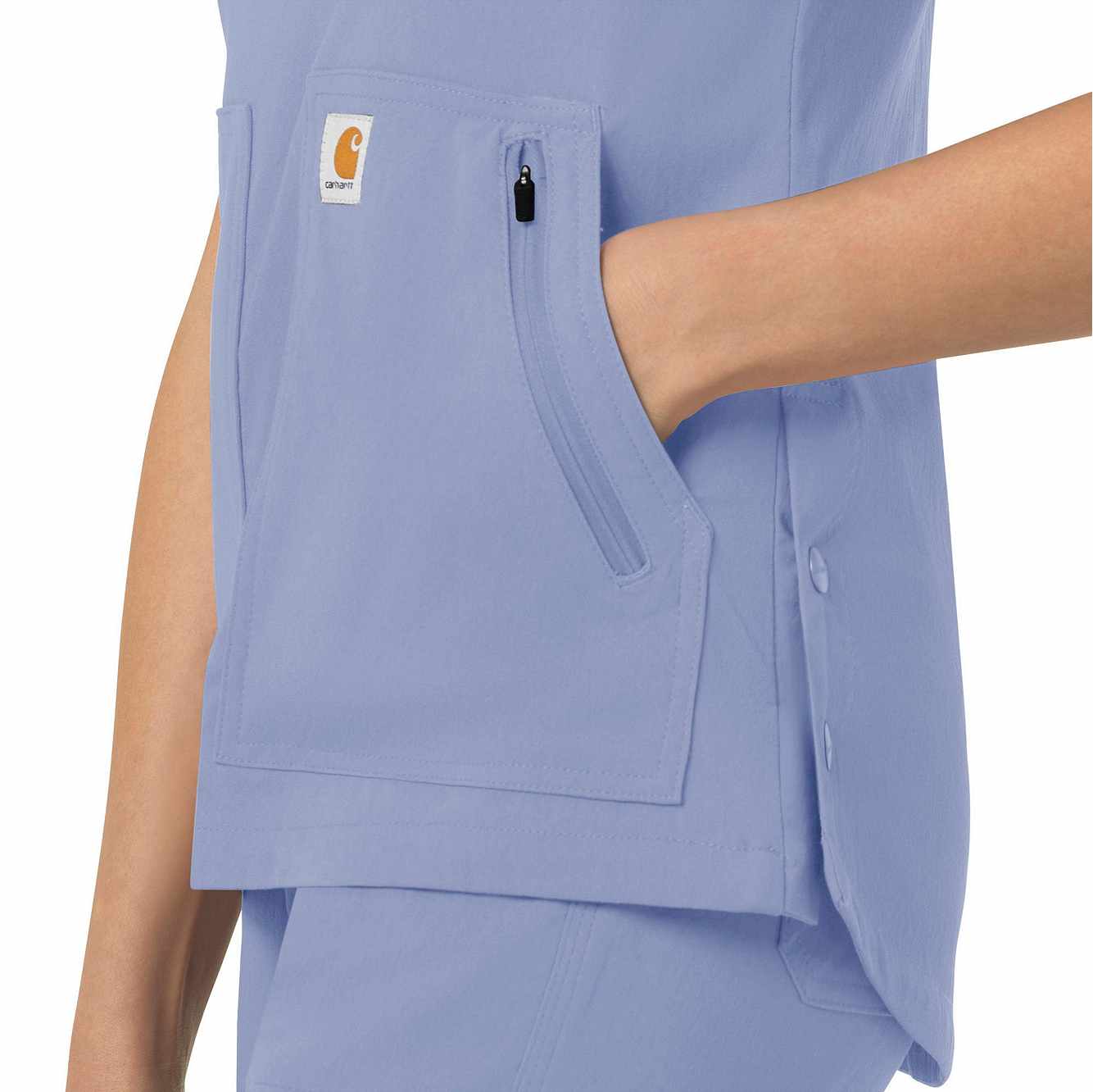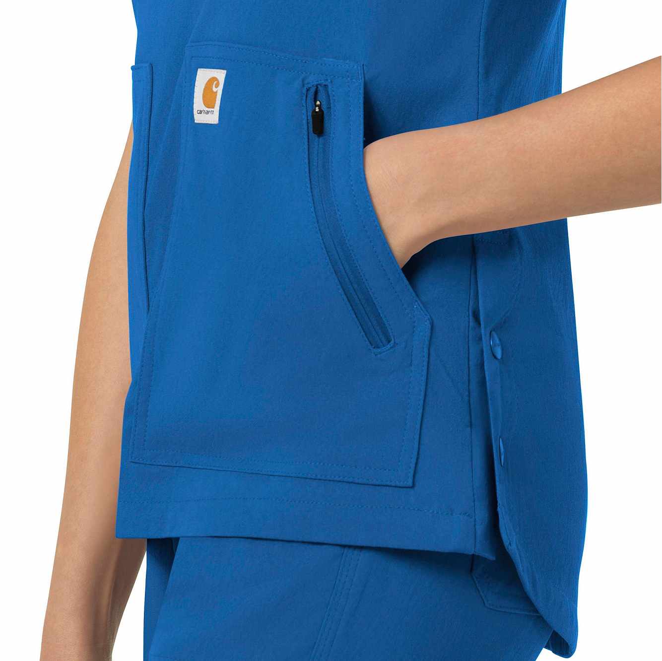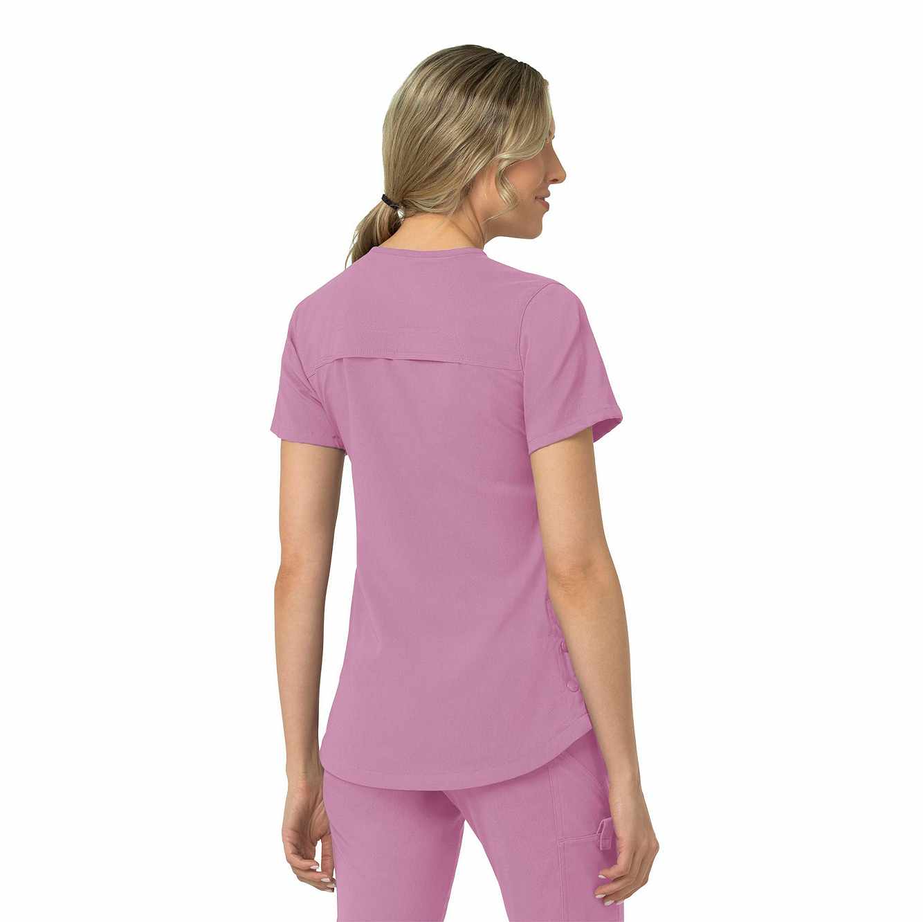 When your workday is non-stop, this women's scrub top keeps you cool and comfortable. Polyester fabric with built-in flex repels water and water-based stains. A mesh-lined back panel allows the air to flow as you move through busy shifts. Multiple pockets, including two angled zip pockets, keep supplies within easy reach.