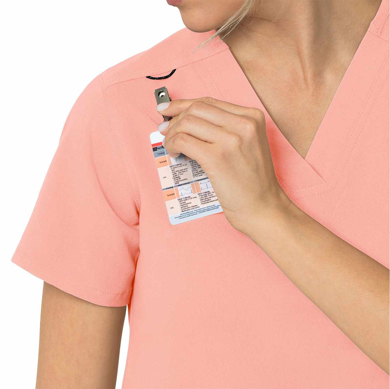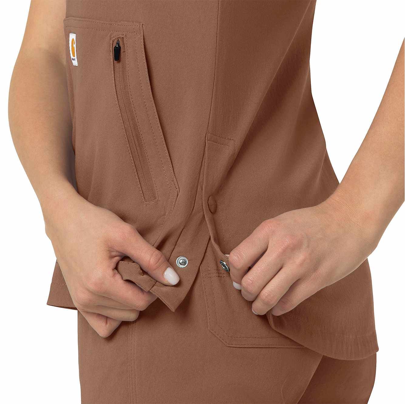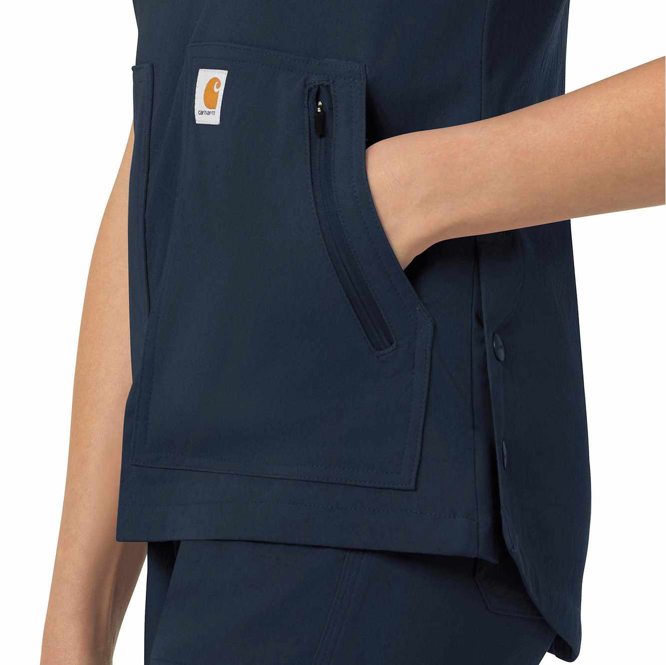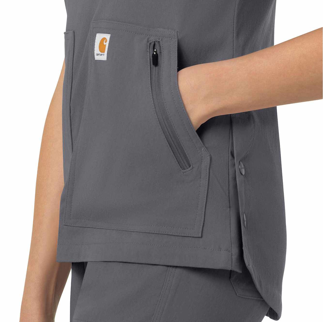 When your workday is non-stop, this women's scrub top keeps you cool and comfortable. Polyester fabric with built-in flex repels water and water-based stains. A mesh-lined back panel allows the air to flow as you move through busy shifts. Multiple pockets, including two angled zip pockets, keep supplies within easy reach.