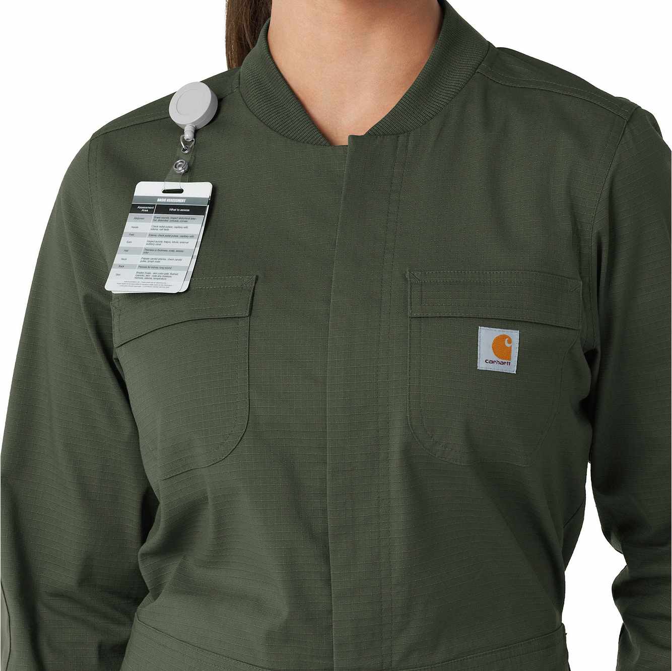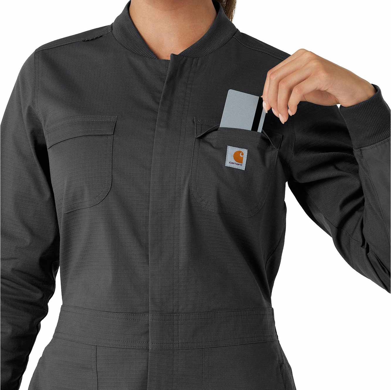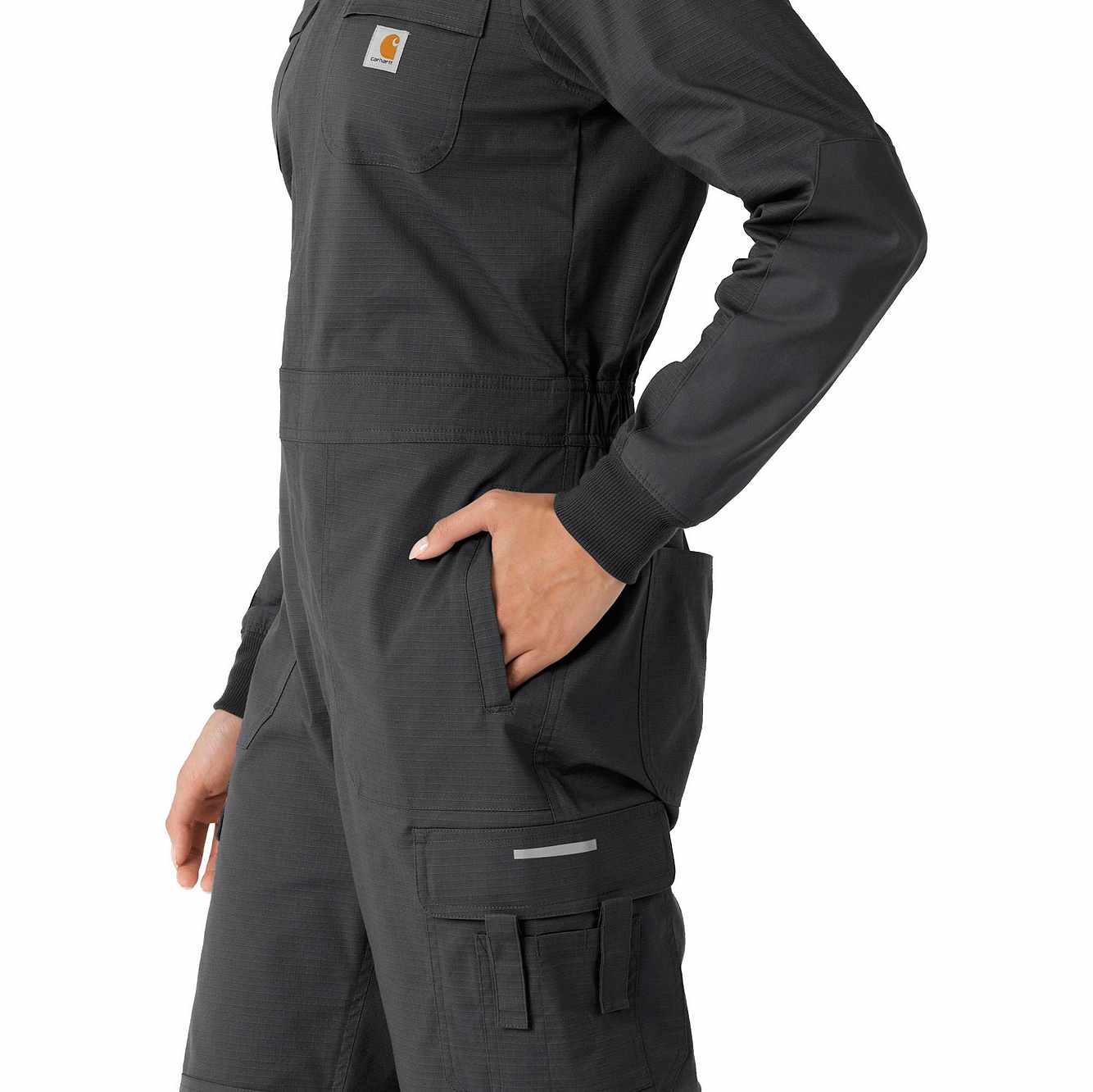 When your work takes you outdoors and into demanding environments, these women's coveralls provide the reliable protection you need to get the job done. Built to withstand the elements and the rigors of physical work, they're crafted from tough yet stretchy Rugged Flex™ ripstop fabric with a Durable Water Repellent (DWR) coating. This combination ensures exceptional durability, flexibility, and protection against moisture, keeping you dry and comfortable in a variety of conditions. Functionality is paramount, and these coveralls are outfitted with a total of 11 pockets, strategically placed to provide ample storage for tools, equipment, and personal items. Whether you need to carry small essentials or larger tools, these pockets ensure everything you need is organized and within reach. Reinforced elbow and knee panels provide added durability and protection in high-wear areas, increasing the lifespan of the garment and enhancing your comfort during demanding tasks. With their combination of durable construction, thoughtful design, and practical features, they're a valuable asset for any professional who faces the elements head-on.