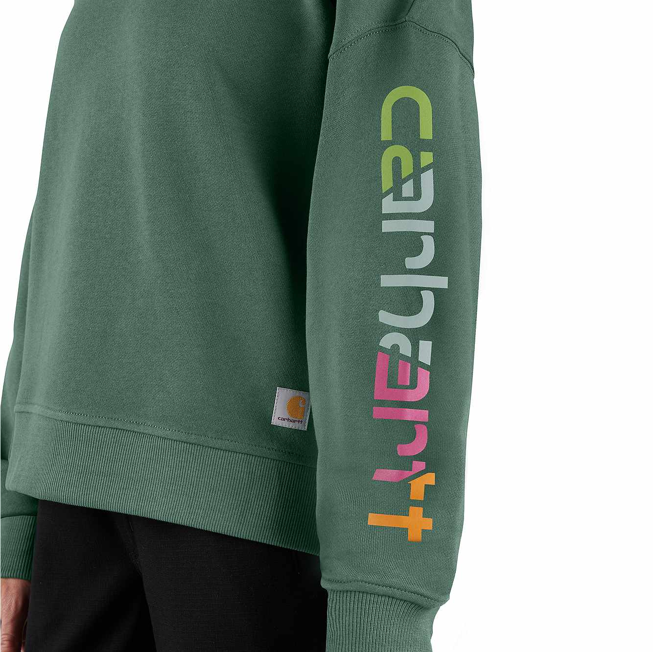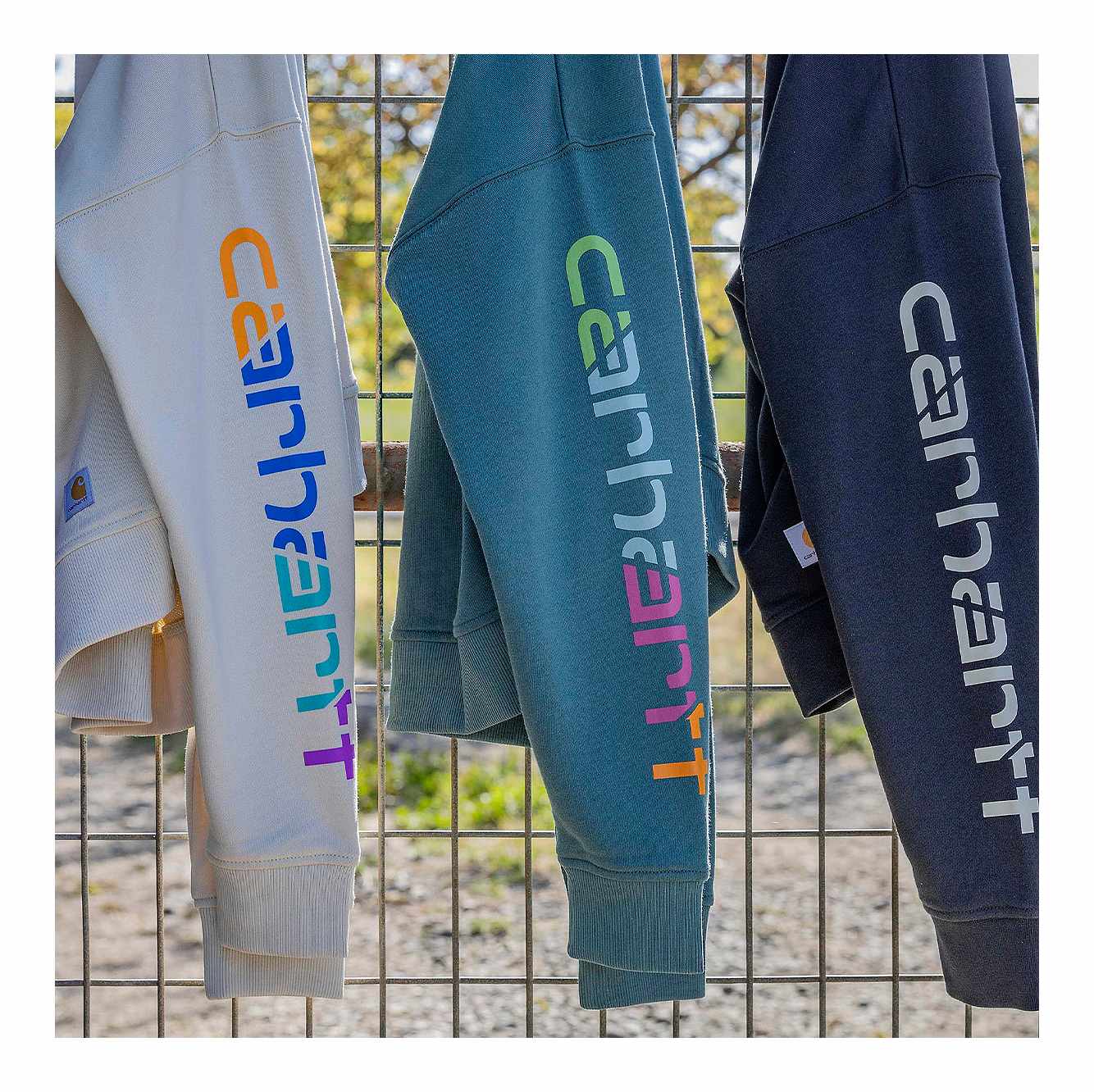 This women's TENCEL™ sweatshirt gives you a loose-fitting layer for work or weekends. Soft and breathable, it's made from lightweight TENCEL™ fibers that hold up to daily wear. Featuring a Carhartt graphic on the sleeve. Powered by TENCEL™ fibers for an incredibly soft, comfortable feel that's equally tough and durable. TENCEL™ Lyocell fibers are derived from sustainable wood sources through sustainably managed forests.