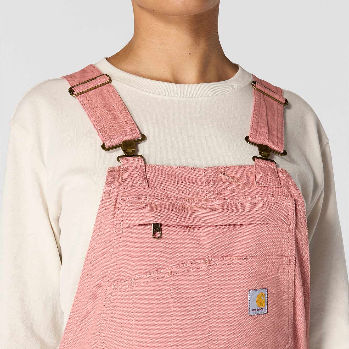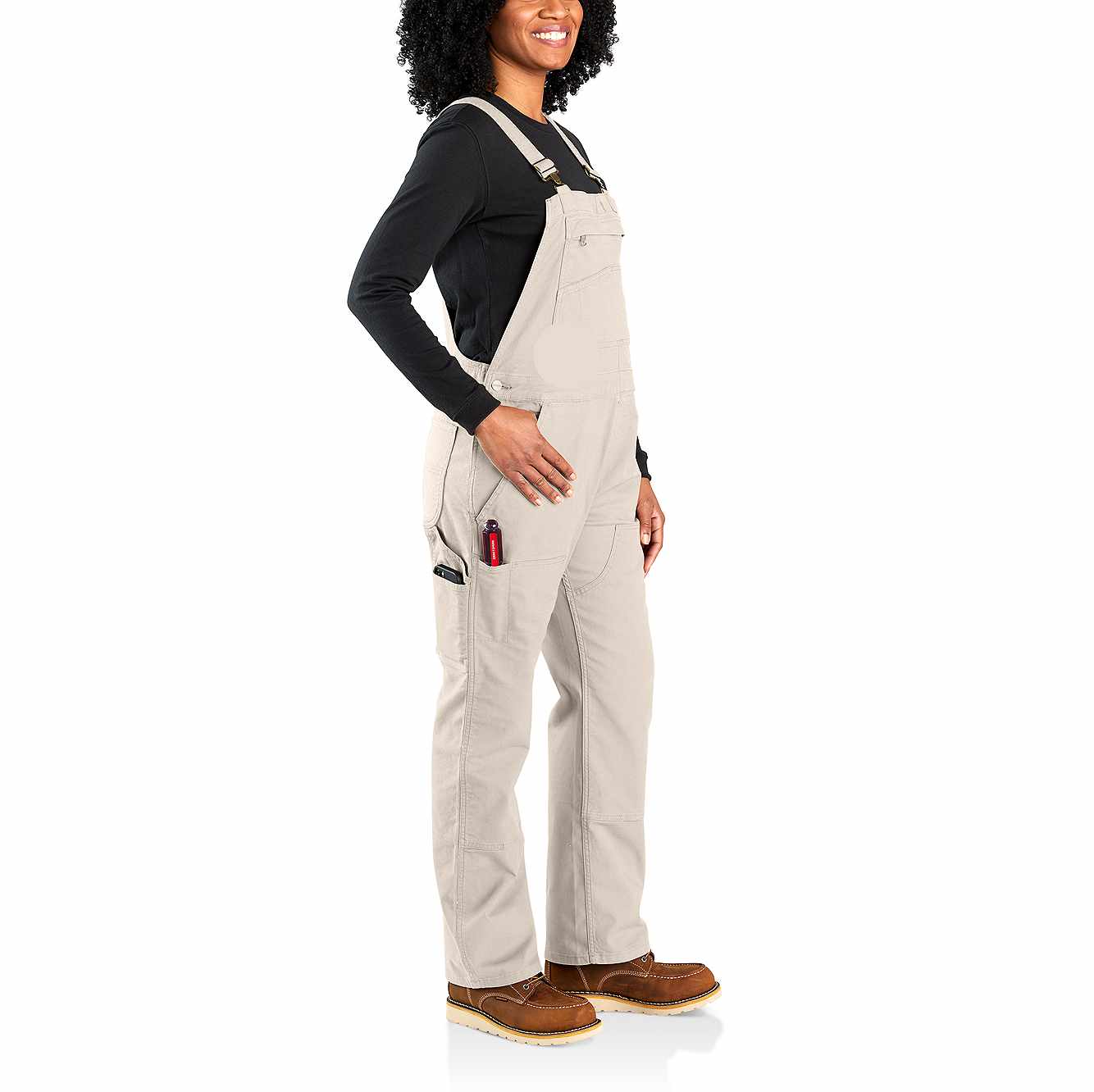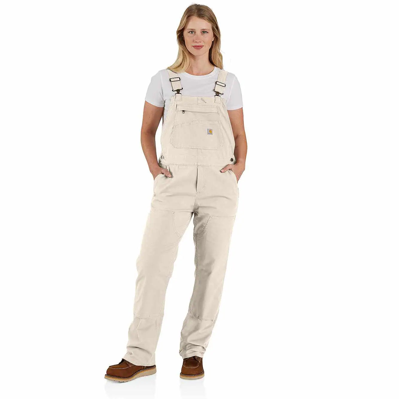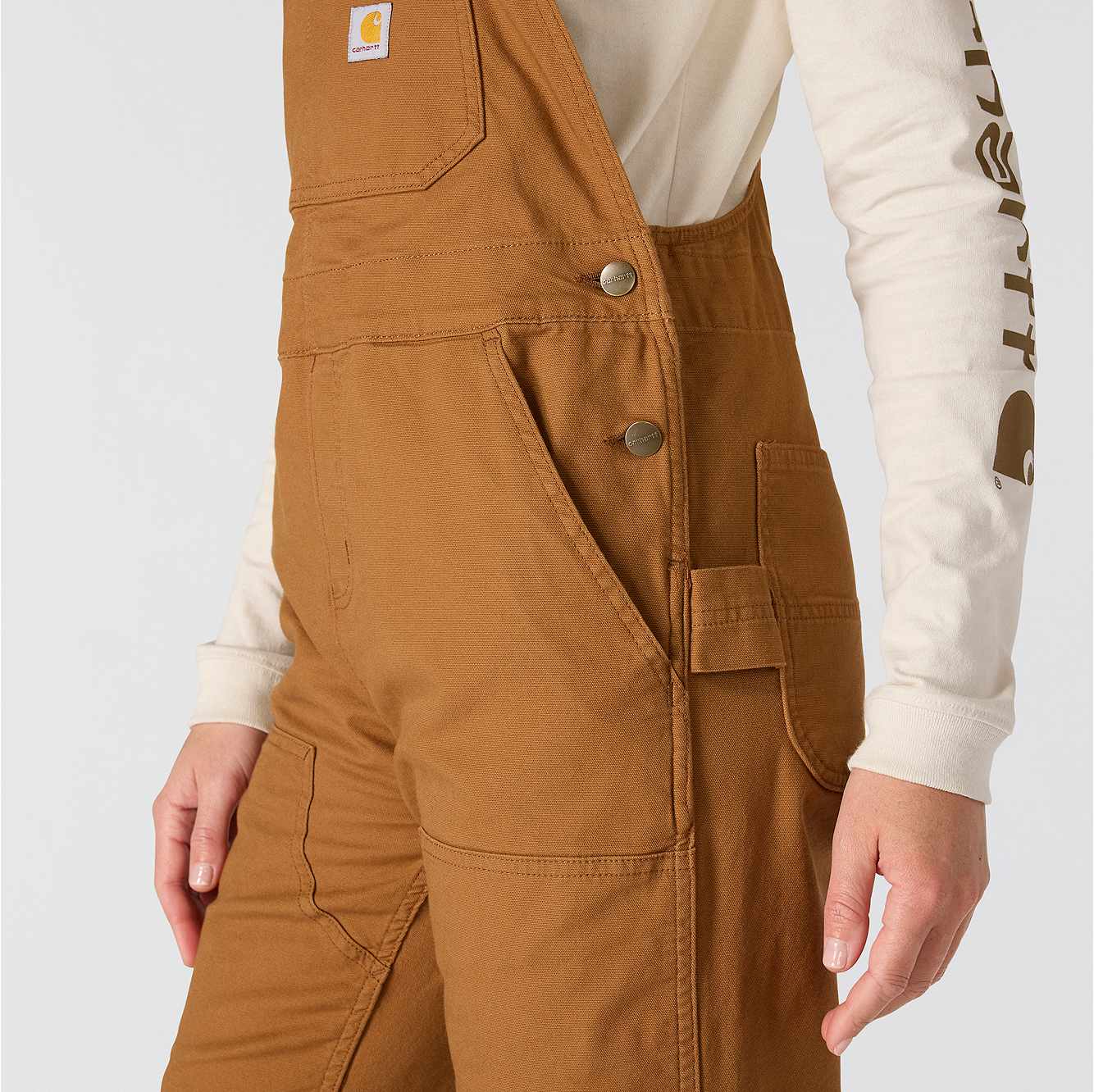 These women's bibs have the classic look of our duck overalls, but with a soft stretch-canvas construction that gives you full freedom to move. The zip pocket on the chest is large enough to fit a phone, and the several slip-in pockets have various sizes to accommodate your different tools. A double layer at the knees increases the durability factor plus gives you a place to stick your knee pads.